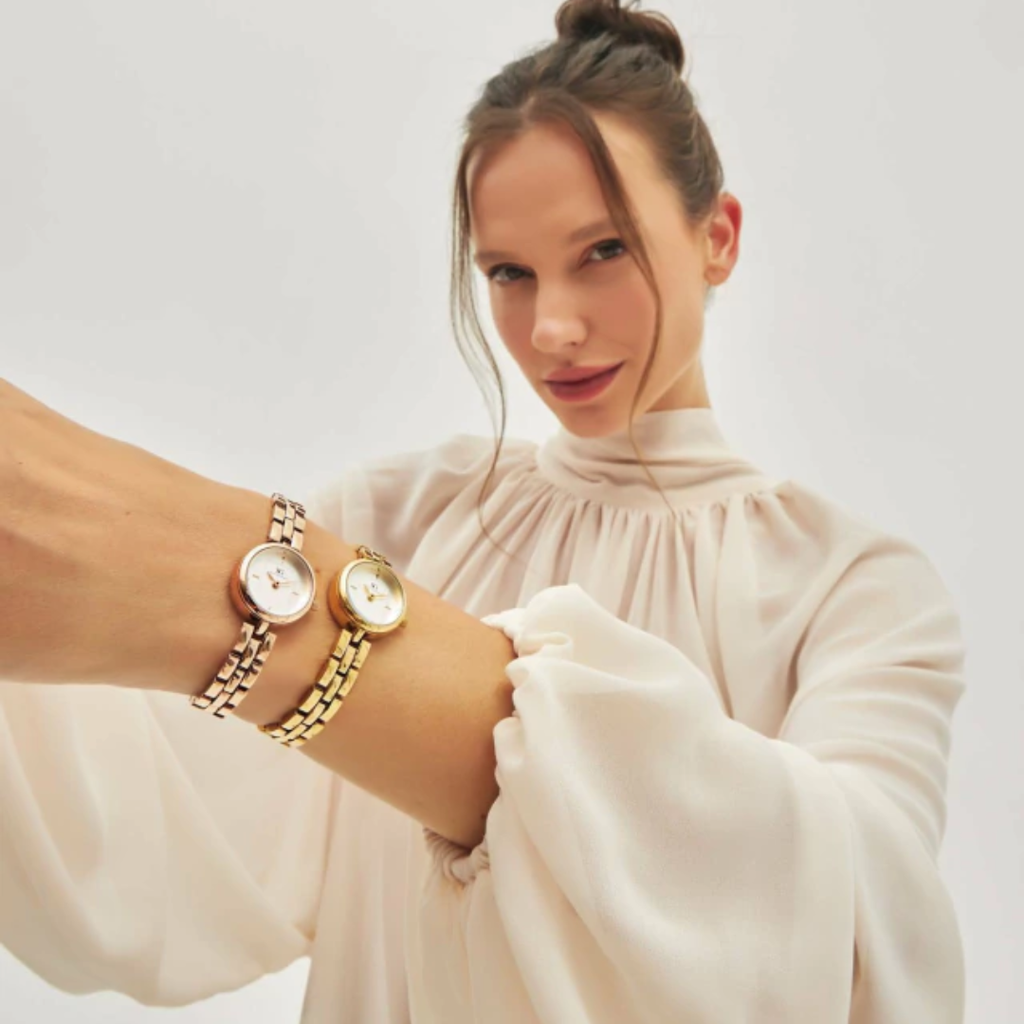 - Pulseira metálica dourada – Toque de luxo e sofisticação.